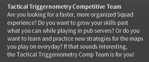 Are you looking for a faster, more organized Squad experience? Do you wish to grow your skills past what you can while playing in pub servers? Do you want to learn and practice new strategies for the maps and layers that you play on every day? The Tactical Triggernometry Competitive Team is for you!